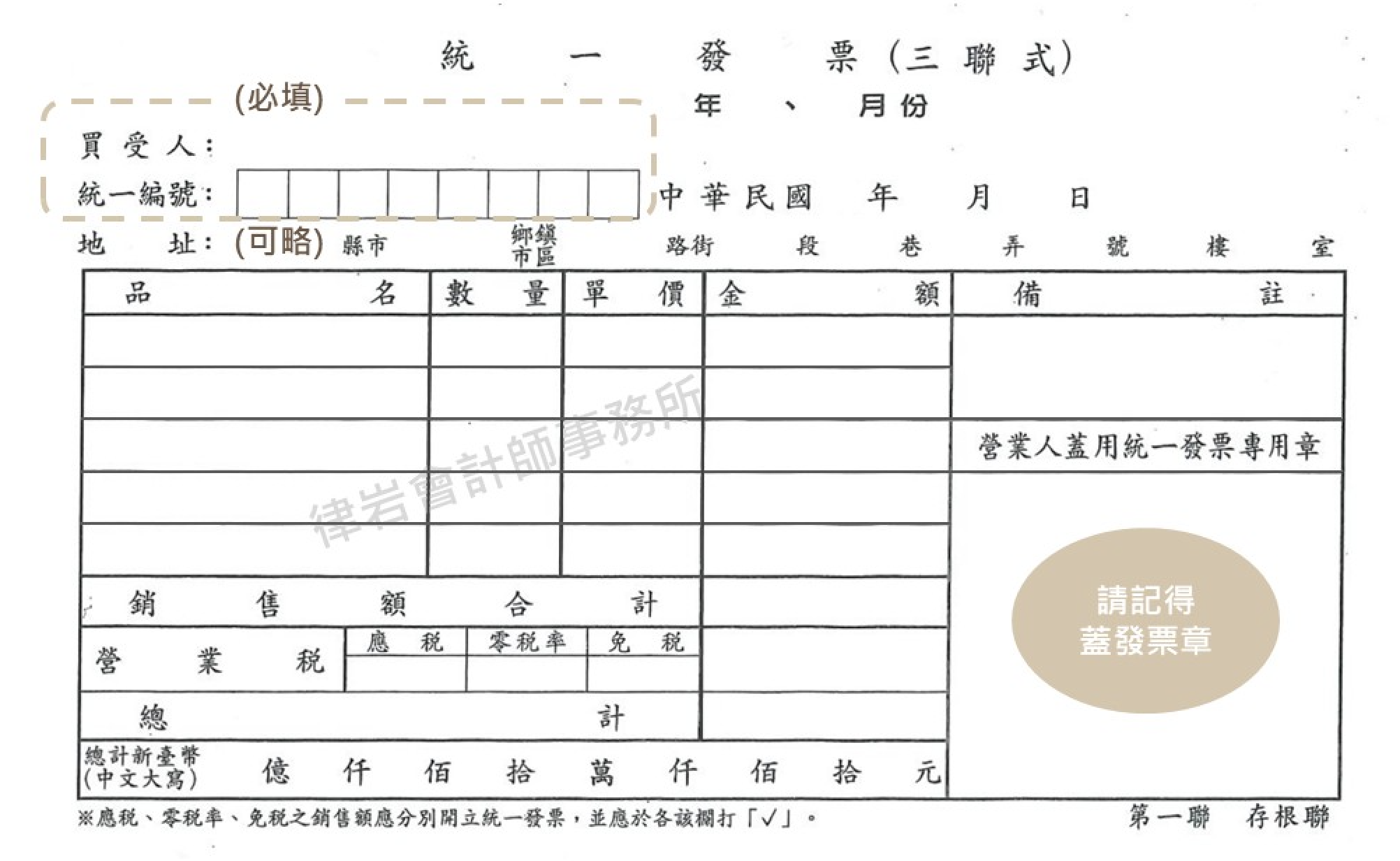 - 三聯式:企業間交易,需買方提供統編報帳。