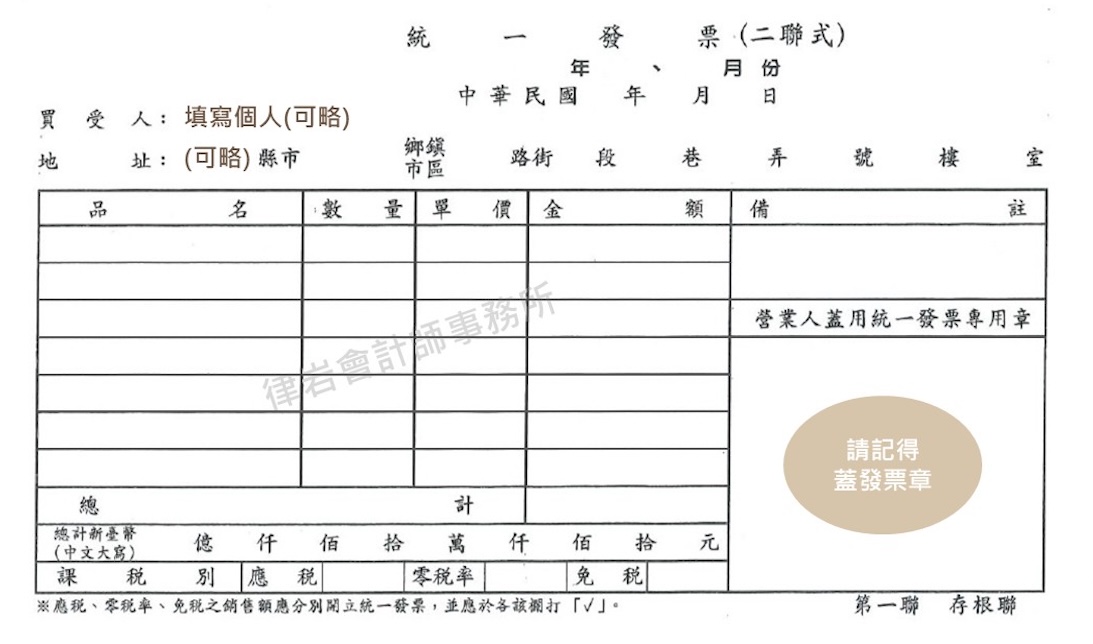 - 金額:銷售額(未稅)、營業稅金額、總計(含稅金額);二聯式不區分出營業稅額。
